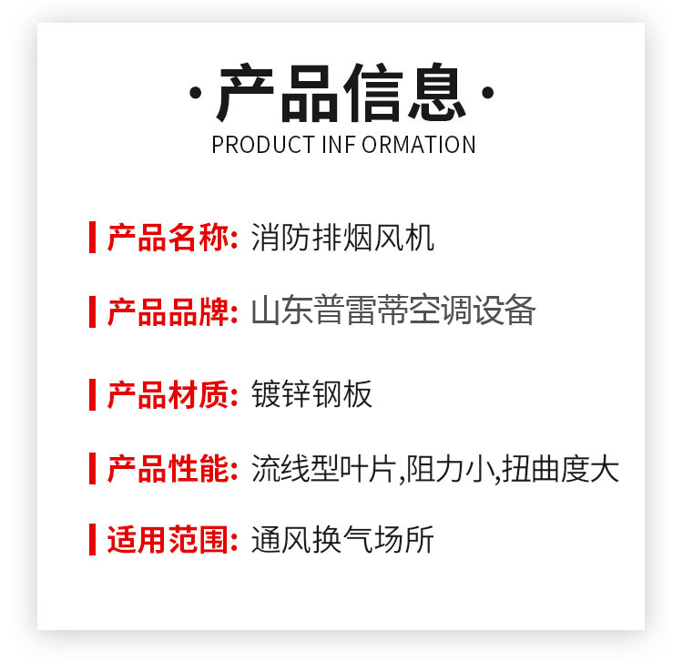 接下來,我們來看看消防排煙風機(jī)的結構。消防排煙風機主要由葉輪、電(diàn)機、外殼、傳動(dòng)裝(zhuāng)置、控製(zhì)係統等部(bù)分組成。葉輪是消防排煙風機的核心部件,負責將(jiāng)空氣吸入並排出;電機為消防(fáng)排煙(yān)風(fēng)機提供動力;外殼用於保護(hù)內(nèi)部零部件,同時起到隔(gé)音、散熱的作用;傳動裝(zhuāng)置將電機的動力傳遞給葉輪;控製係統則負責對消防排煙風機的啟動、停止、調速等操作進行控(kòng)製。