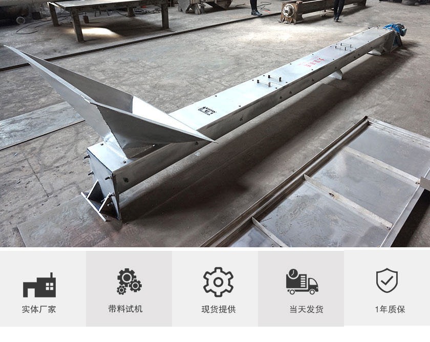 不鏽鋼有軸螺旋輸送機:304或316L製成,造價高,不生鏽耐腐蝕,耐高溫可達(dá)300℃,衛生標準高,多用(yòng)於食品加工廠、醫藥廠或部分化工廠輸送使用,不對物料造成汙(wū)染。