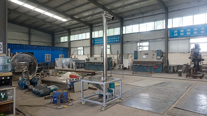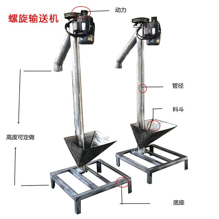 垂直螺旋輸(shū)送機由水平(píng)進料螺旋和垂直螺旋組成(chéng),從料倉或料鬥或從上遊進料裝置(zhì)進料,保證進料(liào)有足夠的倉壓(yā),確保物料能順利地向上輸送,垂(chuí)直提升高度可達8米。